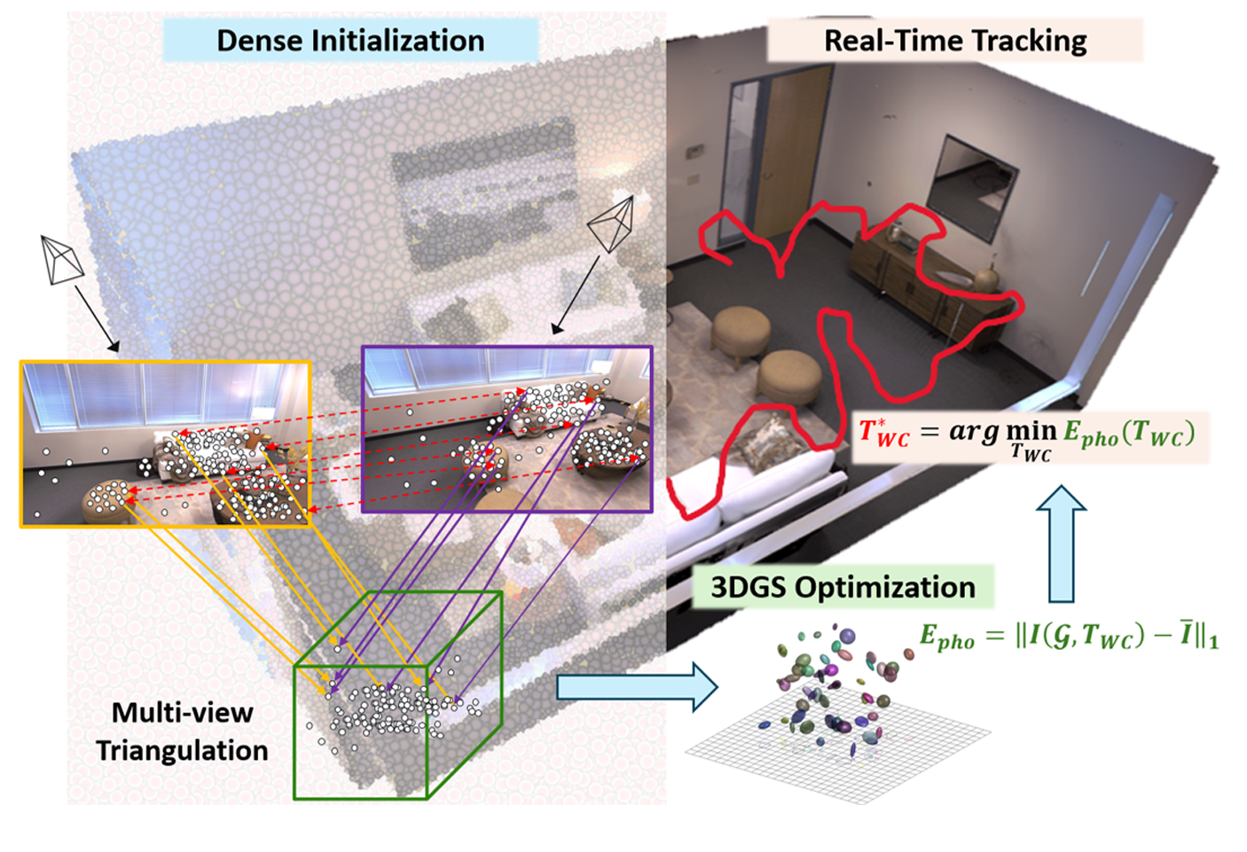 ] .date[ ### 2026.01.16 ] --- <style type="text/css"> .title-slide .remark-slide-number { display: none; } .contents-list { font-size: 30px; font-family: 'Trebuchet MS', sans-serif; line-height: 1.5; } .main-text { font-size: 30px; font-family: 'Trebuchet MS', sans-serif; line-height: 1.5; } .remark-slide-content ul { font-size: 20px; } .remark-slide-content ul ul { font-size: 18px; } .remark-slide-content ul ul ul { font-size: 15px; } .remark-slide-number { font-size: 16px; bottom: 40px; right: 10px; } .remark-slide-content:not(.title-slide)::before { content: ""; position: absolute; bottom: 8px; right: 10px; width: 80px; height: 30px; background: url('fig/lab_logo.jpg') no-repeat center; background-size: contain; } .bottom-center-img { position: absolute; bottom: 60px; left: 50%; transform: translateX(-50%); max-width: 80%; } .bottom-right-img { position: absolute; bottom: 60px; right: 20px; max-width: 40%; } .pull-left, .pull-right { width: 48%; } .pull-left { margin-top: 30px; } .pull-left img, .pull-right img { display: block; width: 100%; } .caption-left { position: absolute; bottom: 50px; left: 25%; transform: translateX(-50%); font-size: 16px; font-style: italic; } .caption-right { position: absolute; bottom: 50px; right: 25%; transform: translateX(50%); font-size: 16px; font-style: italic; } /* .title-slide::after { content: "Computer Vision and Robotics Laboratory, Minsu Kim"; position: absolute; bottom: 30px; left: 50%; transform: translateX(-50%); font-size: 22px; color: #ffffff; font-weight: bold; } */ </style> <!-- class: title-slide count: false --> # Contents .contents-list[ 1. Introduction 2. Method 3. Experiments 4. Conclusion ] --- # Introduction .pull-left[  ] .pull-right[ - 3D Gaussian Splatting(3DGS)의 발전으로 고품질 뷰 합성과 실시간 매핑이 가능 - 하지만 대부분의 파이프라인은 여전히 잔차(residual)에 기반한 밀집화(densification) 에 의존 - 이는 오차가 감지될 때마다 Gaussian을 반복적으로 생성하거나 병합하는 방식 - 이 방식은 결국 최적화 하고자 하는 scene의 최종목표를 계속 바꾸는 것으로 이해할 수 있음 - Gaussian이 계속 사라지거나, 추가되거나, 변형됨 - 그러면 처음부터 잘하자! - RGS-SLAM: Robust Gaussian Splatting SLAM with One-Shot Dense Initialization - 단일 프레임에서 고밀도 Gaussian을 초기화하여 SLAM의 견고성과 효율성을 향상 ] --- # Introduction - 즉, Keyframe에서 한번에 Gaussian을 생성 - 생성한 Gaussian은 꽤나 정확하다고 생각 - Gaussian의 개수는 고정 후, 나머지 mean, covariance, color, opacity등은 최적화 - MCMC....? - 이 방식을 Monocular camera SLAM에 적용해보니 괜찮더라 - 초기값이 정확하기 때문에 쓸만한 지도를 생성하는데까지 시간 단축 - 당연히 pose 추정도 더 안정적 - 기존 MonoGS 파이프라인에서, densification 단계만 feature matching으로 대체함 --- # Method ### RGS-SLAM pipeline <div style="position:absolute; left:50%; top:185px; transform:translateX(-50%); width:80%;"> <img src="fig/fig_2.png" style="width:100%; height:auto;" /> </div> --- # Method ### 1. Gaussian Splatting representaion - Anisotropic Gaussian은 mean, covariance, color, opacity, 를 가짐 $$ G = \{G_i\},\quad G_i = \left(\mathbf{c}_i,\, \alpha_i,\, \boldsymbol{\mu}_i^{W},\, \mathbf{\Sigma}_i^{W}\right),\quad \mathbf{c}_i \in \mathbb{R}^3,\ \alpha_i \in [0,1],\ \boldsymbol{\mu}_i^{W} \in \mathbb{R}^3,\ \mathbf{\Sigma}_i^{W} \in \mathbb{R}^{3\times 3},\ \mathbf{\Sigma}_i^{W} \succ 0. $$ - 현재 카메라 pose(world-to-camera) `$$T_{WC} = [\mathbf{R}\mid \mathbf{t}]$$` - 3D Gaussian `\(\mathcal{N}(\boldsymbol{\mu}_i^{W}, \mathbf{\Sigma}_i^{W})\)`를 투영하면 이미지 평면의 2D Gaussian을 얻음 `$$\boldsymbol{\mu}_i^{I} = \pi\!\left( T_{WC}\, \boldsymbol{\mu}_i^{W} \right),\qquad \mathbf{\Sigma}_i^{I} = \mathbf{J}_i\, \mathbf{R}\, \mathbf{\Sigma}_i^{W}\, \mathbf{R}^{\mathsf{T}}\, \mathbf{J}_i^{\mathsf{T}}$$` - 픽셀 `\(p\)`의 색은 alpha blending으로 계산 `$$C_p = \sum_{i\in \mathcal{N}(p)} \mathbf{c}_i\,\alpha_i\, \prod_{j=1}^{i-1}\left(1-\alpha_j\right)$$` --- # Method ### 2. Tracking and Camera Pose Optimization - Objective per frame update - 매 이미지 frame마다 camera pose `\(T_{WC}\)`를 추정 - 랜더링된 이미지가 관측이미지(GT)와 최대한 비슷하도록 `\(T_{WC}\)`를 업데이트 - 렌더링 이미지(예측)와 관측 이미지(GT)와의 Photometric error `$$E_{\mathrm{pho}} = \left\| I(\mathcal{G}, T_{WC}) - \bar{I} \right\|_{1}$$` - 여기서, 기존의 방식처럼 photometric error를 그대로 쓰면 noise에 대응하기 어려움 - affine brightness model을 도입하여 조명 변화에 대응 - 보정을 위한 gain과 bias 도입 `$$\left(g_I, b_I\right) = \arg\min_{g,\,b} \sum_{x \in \Omega_I} \left( I(x) - g\,\hat{I}\left(x; \mathcal{G}, T_{WC}\right) - b \right)^2$$` --- # Method - 매 frame마다 gain과 bias를 도입해서 이미지 보정 `$$\tilde{I}\left(x; \mathcal{G}, T_{WC}\right) = g_I\, \hat{I}\left(x; \mathcal{G}, T_{WC}\right) + b_I$$` - 다만, sequential한 이미지 특성상 rendered image와 observed image의 차이가 클 수 있음 - 따라서, pixel마다 weight를 계산할 수 있도록 함 `$$w_I(x) = w_{\alpha}(x)\, w_{\nabla}(x)$$` `$$w_{\alpha}(x) = \operatorname{clip}\!\left(\frac{\hat{\alpha}(x)}{\tau_{\alpha}},\, 0,\, 1\right)$$` `$$w_{\nabla}(x) = \operatorname{clip}\!\left(\frac{\left\|\nabla I(x)\right\|_2}{\tau_{\nabla}},\, 0,\, 1\right)$$` - 따라서, 최종 tracking loss는 다음과 같음 `$$\mathcal{L}_{\mathrm{track}}\left(T_{WC}\right) = \sum_{x\in\Omega_I} w_I(x)\,\left\| I(x) - \tilde{I}\left(x; \mathcal{G}, T_{WC}\right) \right\|_{1}$$` --- # Method - Minimal Pose Jacobians on SE(3) for Pose update `$$T_{WC} \leftarrow \exp\!\left(\hat{\xi}\right)\, T_{WC}$$` - Pose `\(\xi\in\mathfrak{se}(3)\)`에 대한 mean/cov Jacobian - `\([\cdot